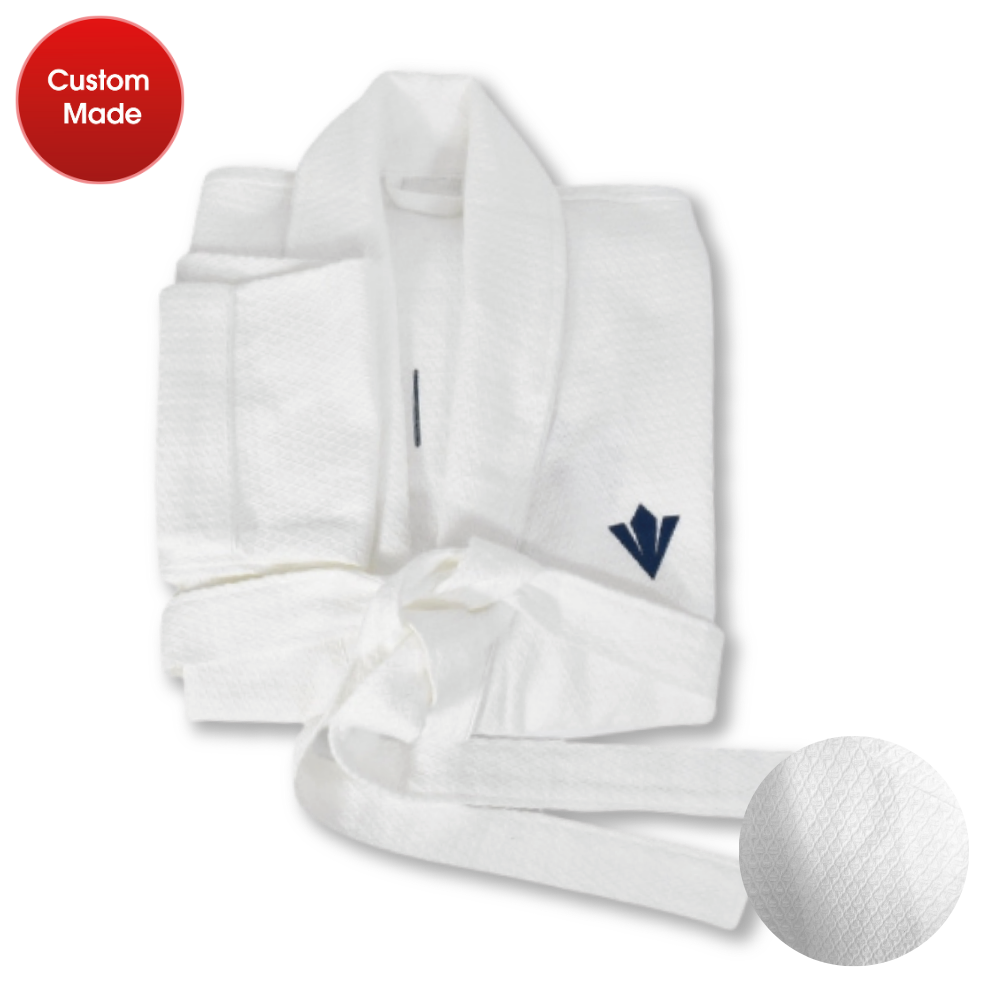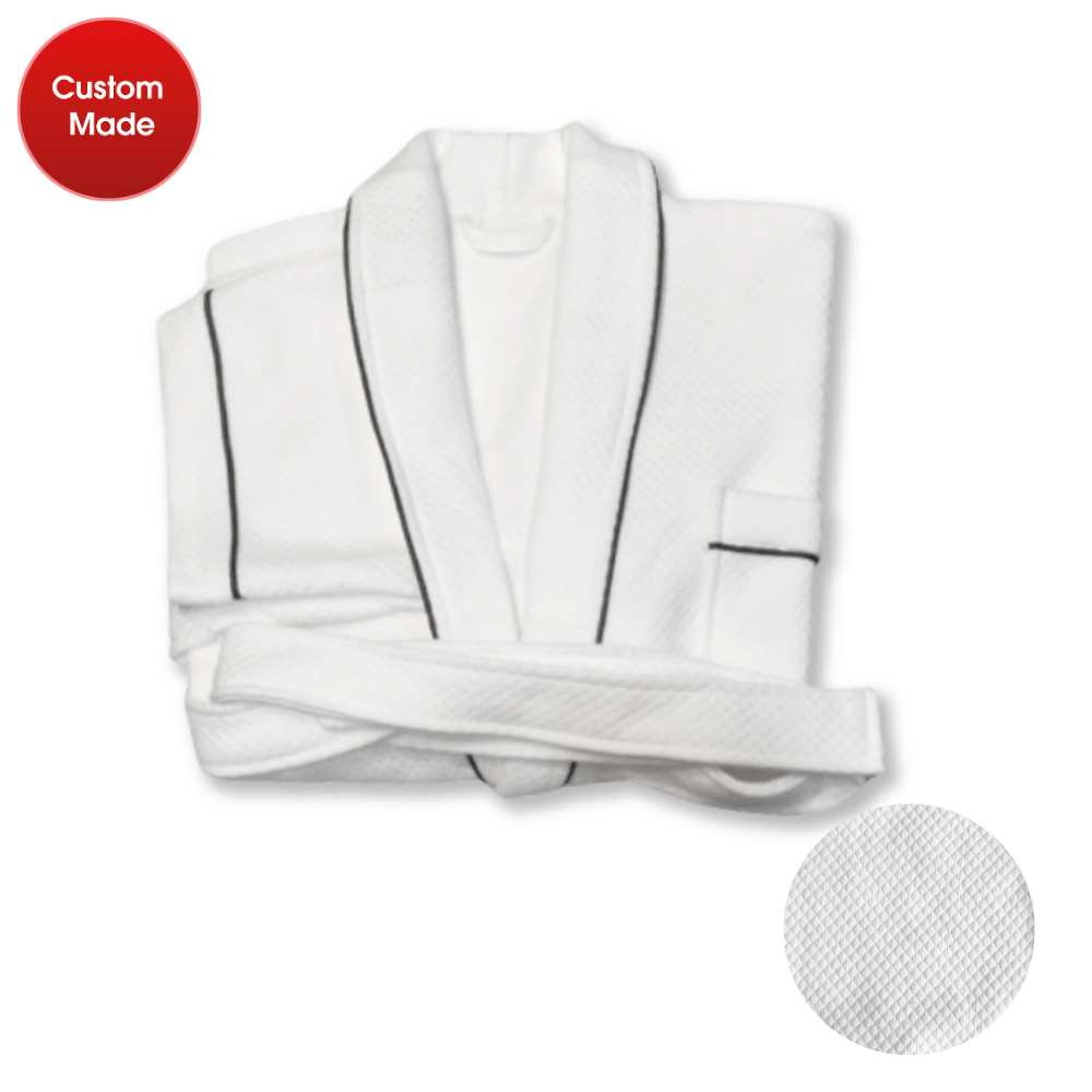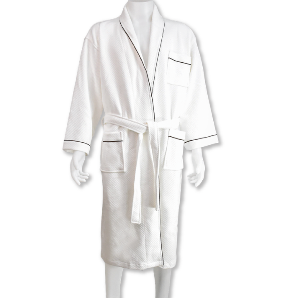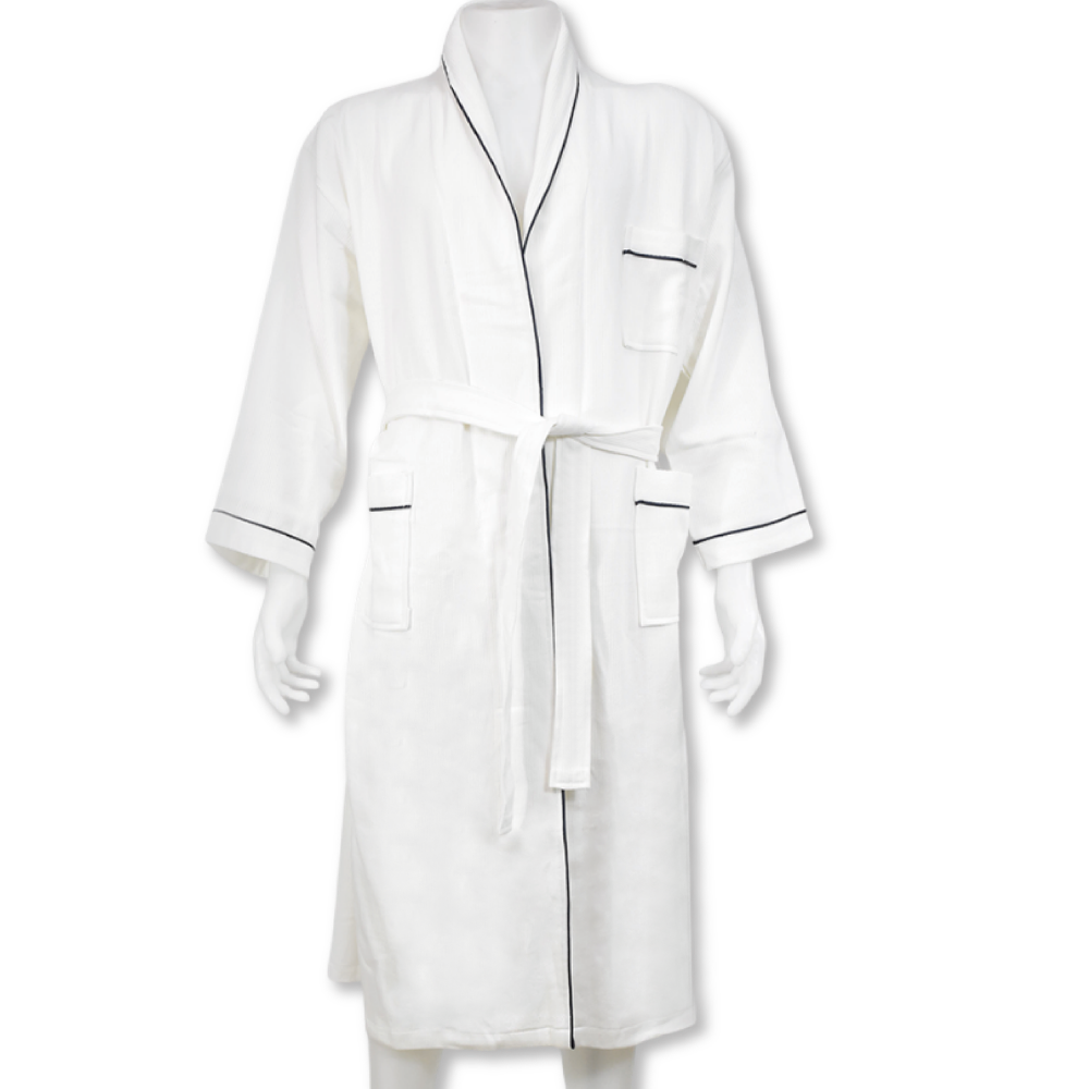 ชุดคลุมอาบน้ำ จากผ้าลูกฟูกพร้อมแถบกุ๊นสีน้ำเงิน – XL # สีขาว (กระเป่า 3 ด้าน)