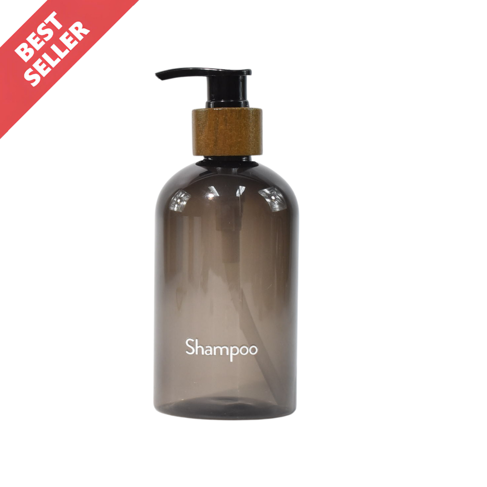 ชื่อสินค้า[TH] : ขวดปั๊มพลาสติกพร้อมฝาปั๊มพลาสติกลายไม้ #สีน้ำตาลแบบใส