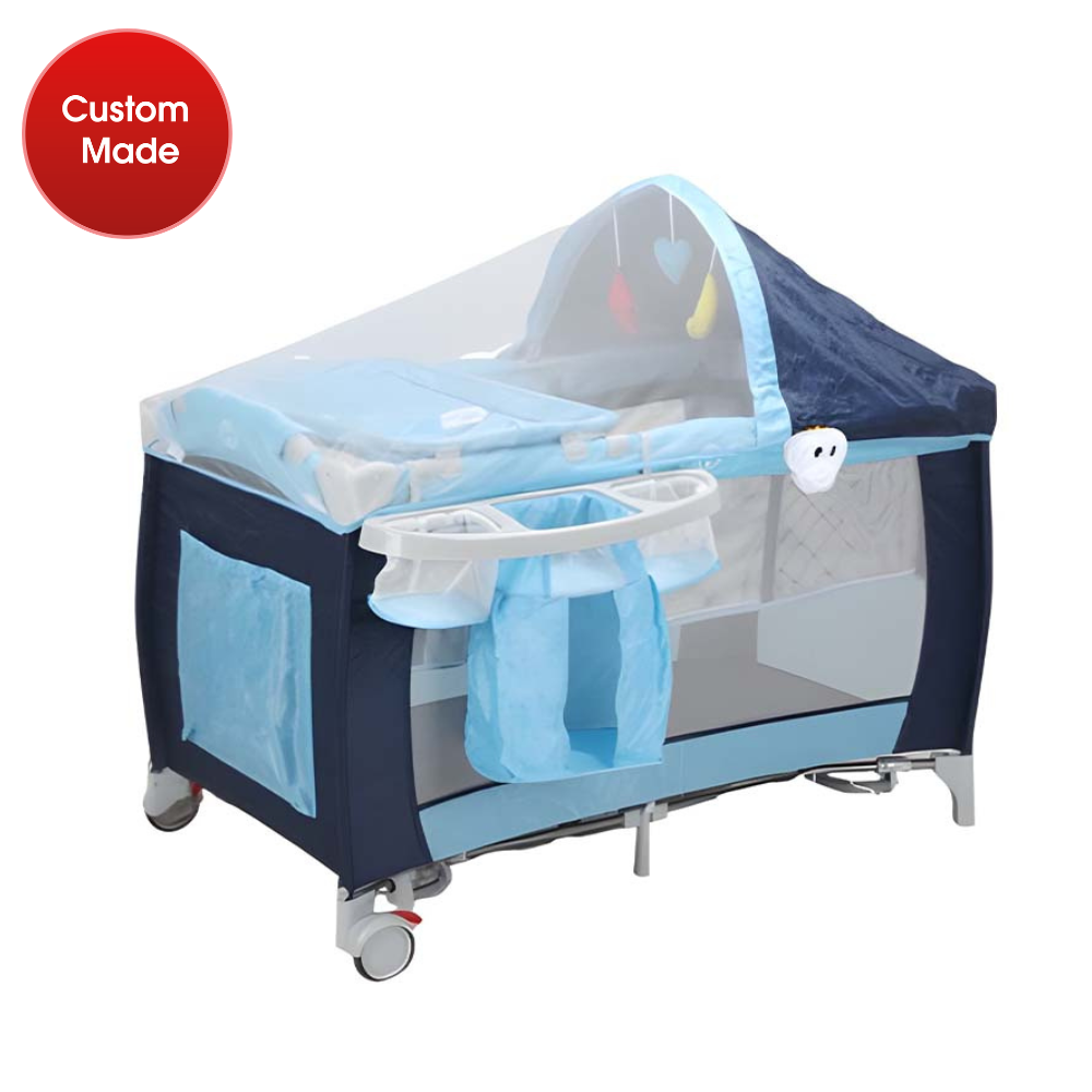 Including : Canopy with three toys and mesh /With hook second layer/ Diaper change station / With 3 hole storage /With rocking bars / With toy bag / With game entrance / Wheels with brake – ผู้ปกครองควรดูแลและไม่ควรใส่ของเกินน้ำหนักที่ระบุไว้ เตียงสำหรับเปลี่ยนผ้าอ้อมเหมาะสำหรับเด็กอ่อนและไม่ควรปล่อยให้เด็กนอนหลับในเตียงนี้