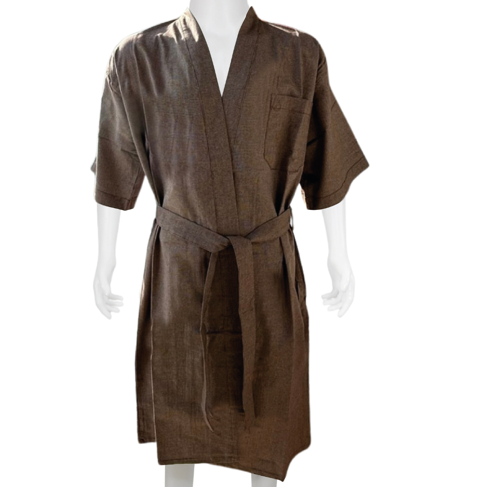 ชุดคลุมอาบน้ำ พร้อมแถบกุ๊นสีน้ำตาลอ่อน – XL # สีขาว (กระเป่า 3 ด้าน)